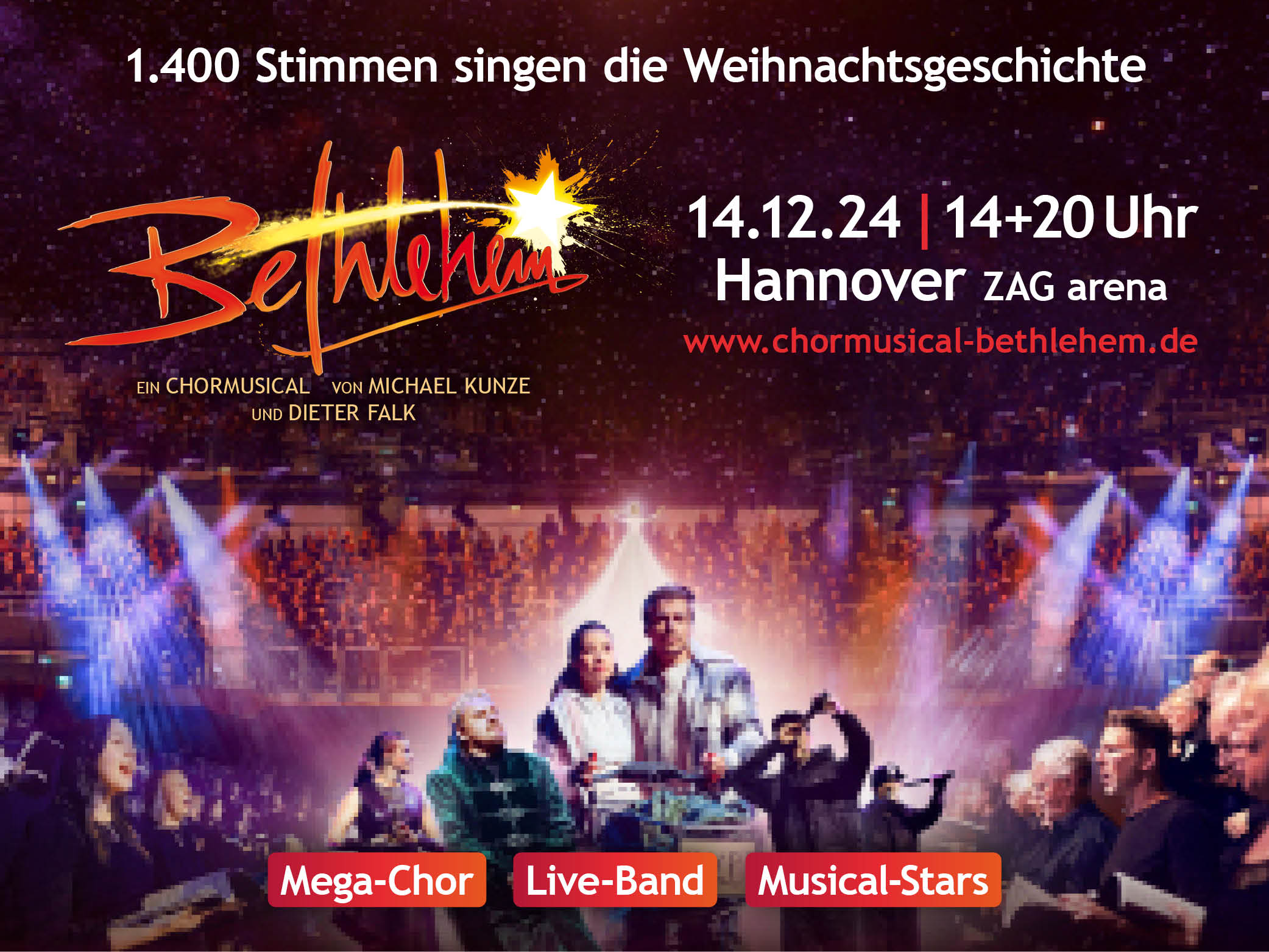 Bei dem Chormusical Bethlehem von Michael Kunze und Dieter Falk ist der Chor der Star. Bis zu 2.400 Sängerinnen und Sängern erzählen gemeinsam mit einer Live-Band und einem Musicalensemble am 14.12.2024 in der ZAG arena in Hannover die Geschichte von Weihnachten.