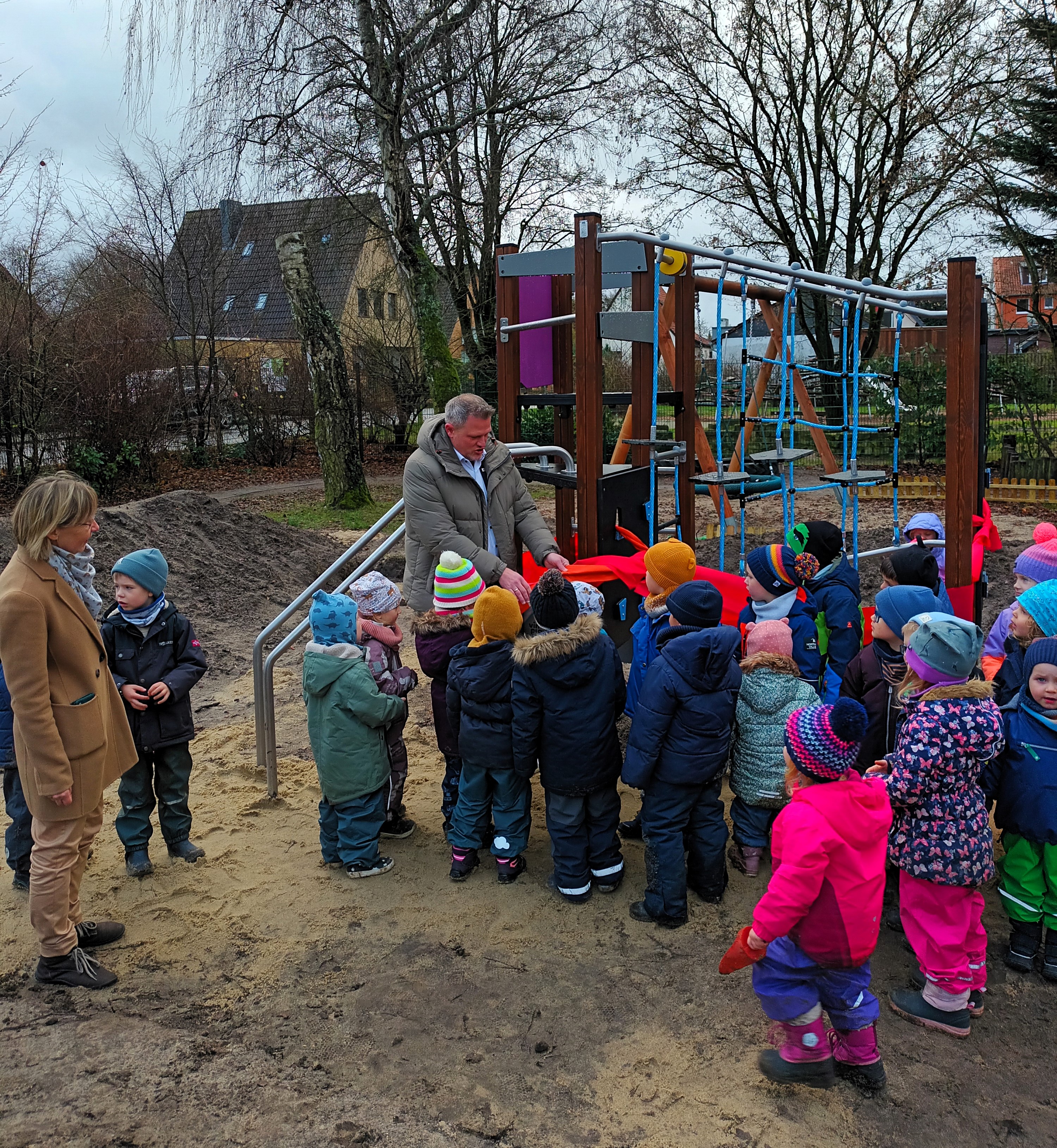 Dirk Suhrkamp schaut noch etwas skeptisch auf die Kletterstangen und Seile, doch dem Mann sei verziehen, er muss heute nur einer Tätigkeit nachgehen, die er als Sparkassen-Direktor für die Region Celle hervorragend beherrscht: Das dicke rote Geschenkband durchschneiden, mit dem das Objekt der Begierde dekoriert ist. Hilfe erhält er dabei von 20 Kindern der Kita „An der Christuskirche“, die zwar brav den offiziellen Akt verfolgen, aber eigentlich nur Augen für eben jene Kletterstangen und Seile hat, auf die sich der Mann von der Sparkasse vermutlich nicht mehr wagen würde.