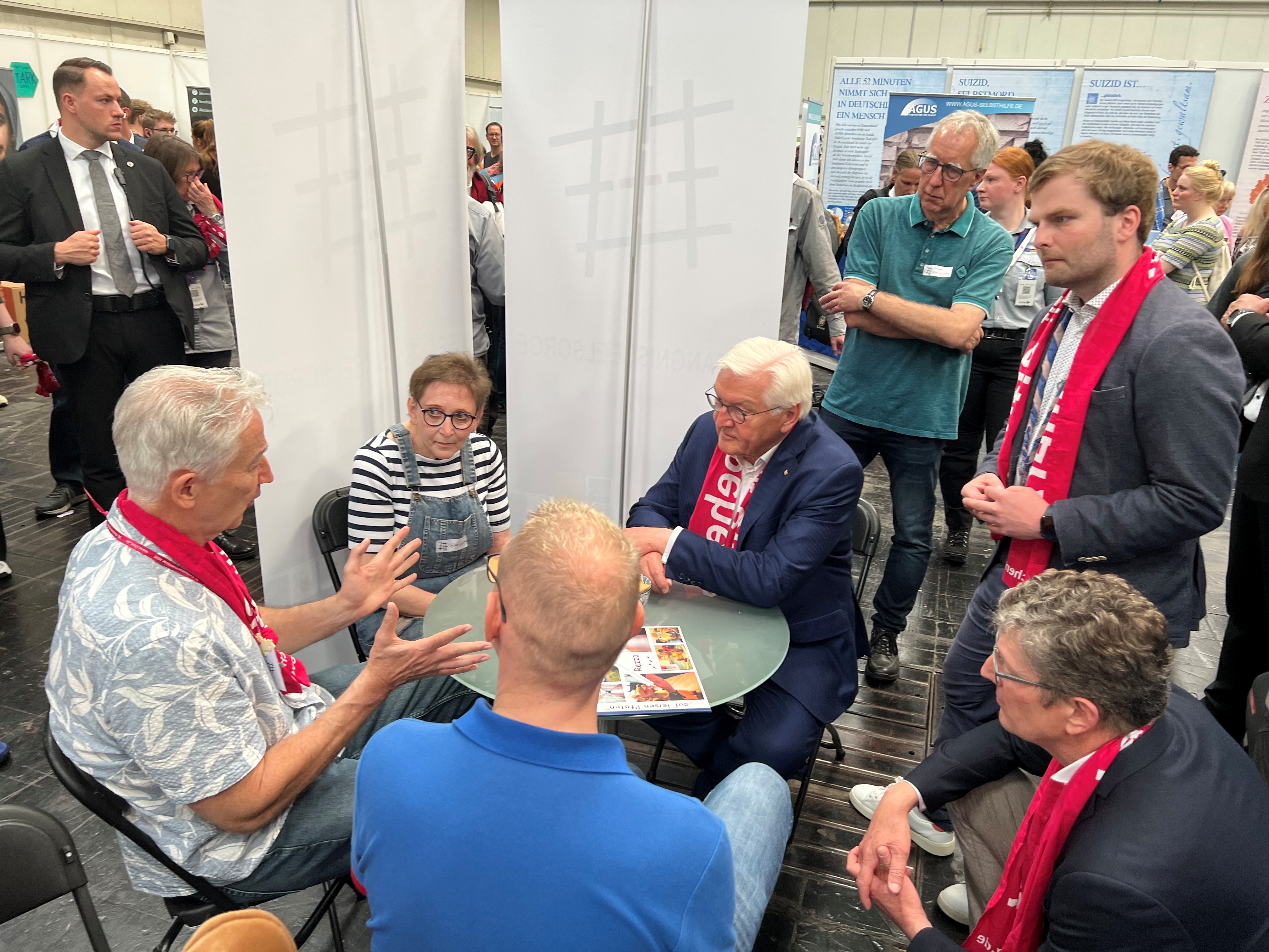 Nach einigen Fragen an die Seelsorgenden des Standes wandte er sich Kindern zu, die sich gerade das Vater-Kind-Projekt in einer Anstalt erklären ließen. Die Kinder stellten ihm das Projekt dann voller Überzeugung einfach selbst vor, sie hatten sich zuvor über die Situation von Kindern inhaftierter Väter erkundigt. Noch ein paar Fotos mit jungen und älteren Gesprächspartner*innen und der Bundespräsident zog weiter.