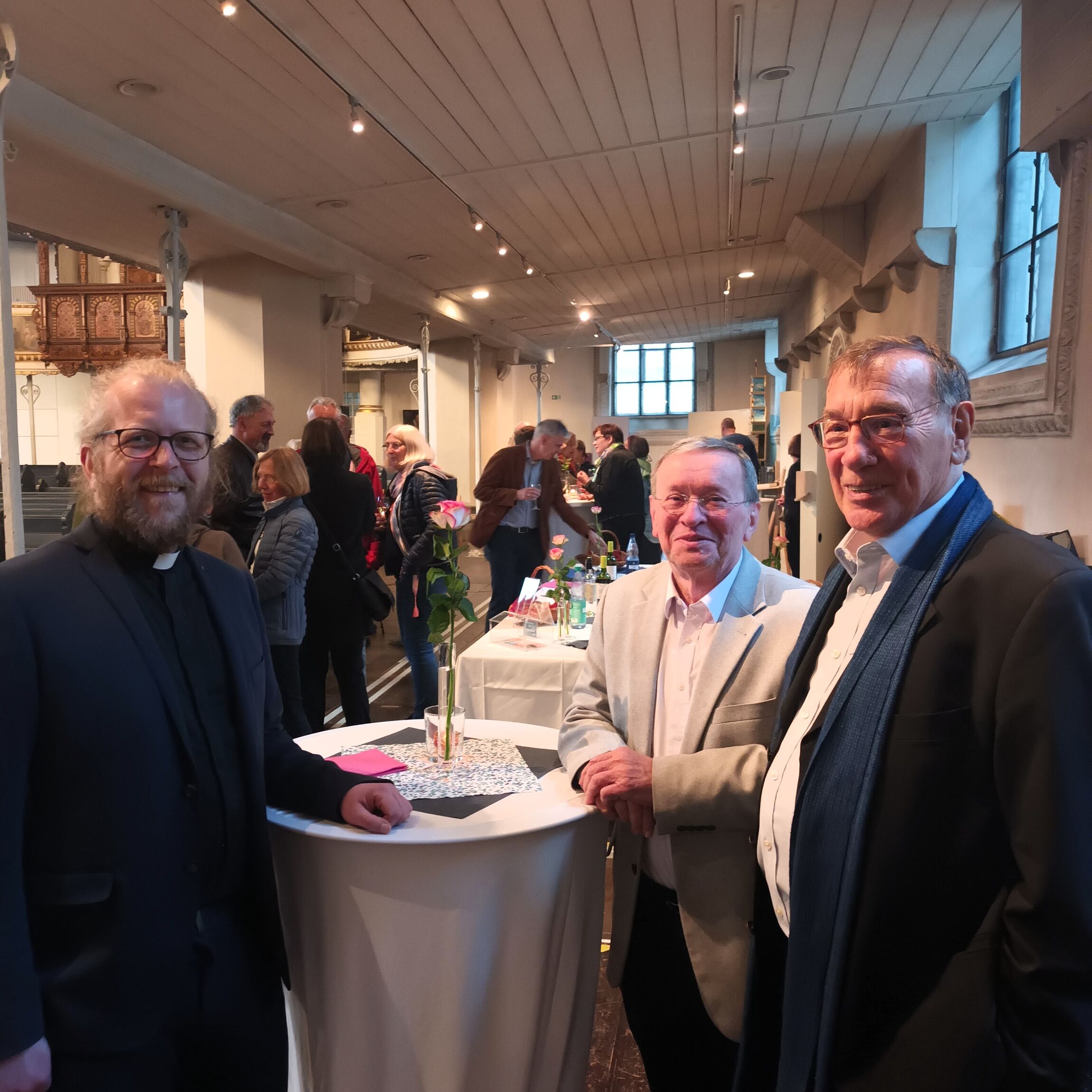Wie üblich trafen sich Besucherinnen und Besucher anschließend zu Snacks und Getränken im Seitenschiff der Stadtkirche, der Applaus hallte da noch nach. Nicht nur für Dietmar Herbst, sondern auch für die hervorragende musikalische Begleitung von Almut Höner zu Guntenhausen und Guido Jänke.