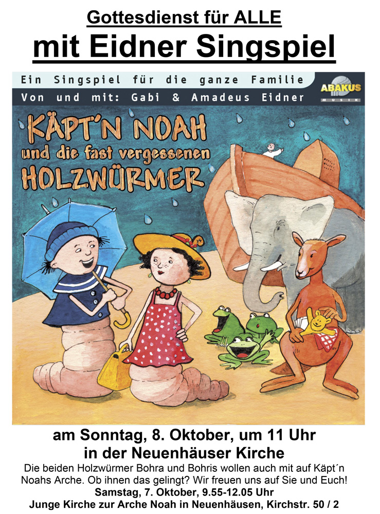 Herzliche Einladung an alle Kinder, Familien und junggebliebene Erwachsene zum Gottesdienst mit Singspiel am Sonntag, 8. Oktober, 11.00 Uhr, in der Neuenhäuser Kirche, Kirchstr. 50. Die Holzwürmer „Bohra & Bohris“ beobachten Noahs Reisevorbereitungen und stellen fest, dass schon fast alle Tierarten, die sich im Konzert mit lustigen Mitmach-Liedern den Kindern und ihren Freunden vorstellen, an Bord der Arche sind. Noah und seine Söhne verwenden für den Bau des Schiffes nur kerngesundes Holz vom Feinsten und da haben Bohra und Bohris mit ihren Wohnorten wahrlich schlechte Chancen, mitgenommen zu werden. Werden sie am Ende mitkommen? Am Samstag, 7. Oktober, 9.55-12.05 Uhr sind alle 4-14-Jährigen herzlich eingeladen zur Jungen Kirche zum Thema Noahs Arche und die Flut in der Neuenhäuser Kirche.