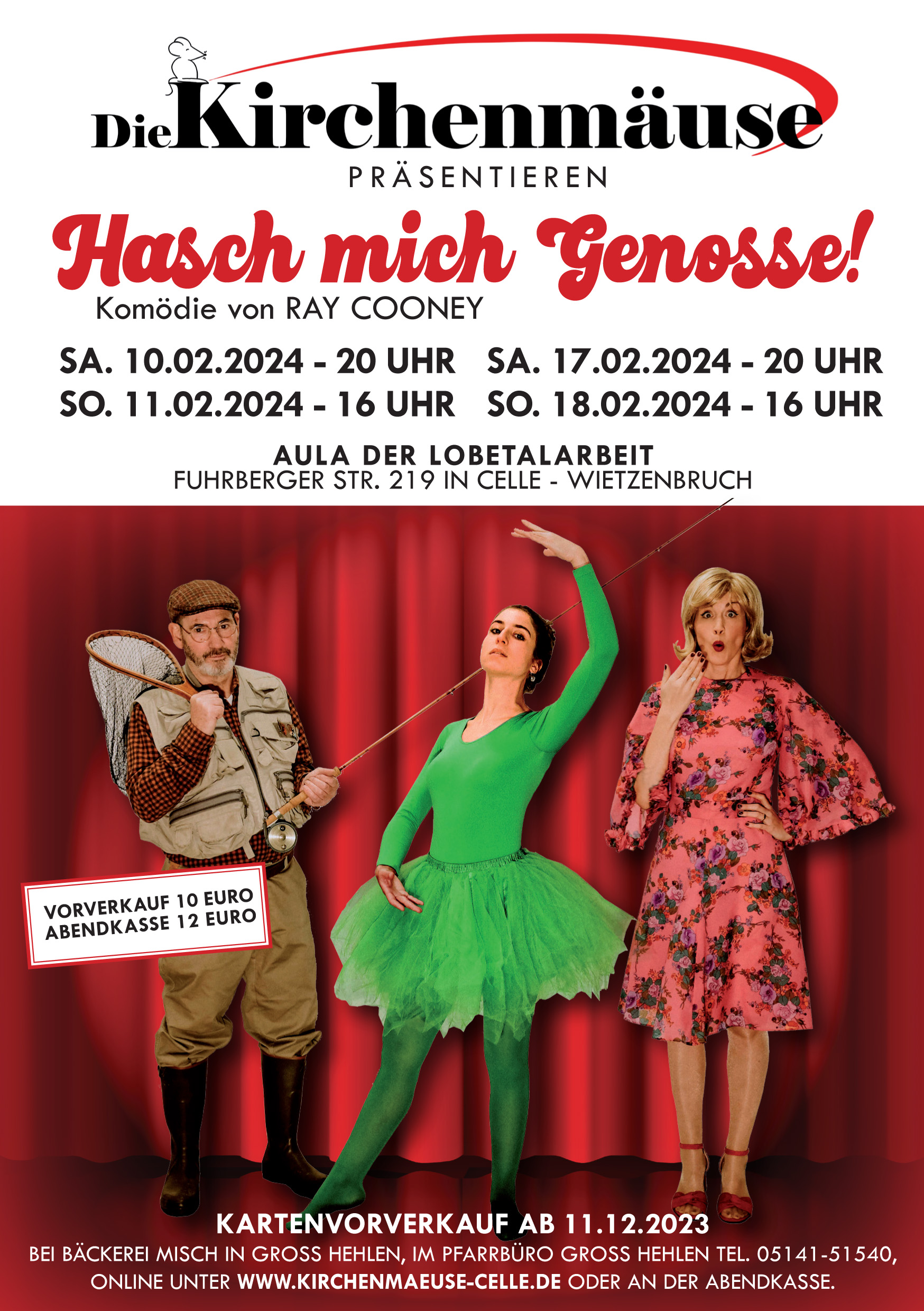 Premiere des Stücks ist am 10. Februar 2024 um 20 Uhr in der Aula der Lobetalarbeit in der Fuhrberger Straße 19 in Celle-Wietzenbruch. Weitere Auftritte finden am 11. Februar (16 Uhr), den 17. Februar (20 Uhr) und 18. Februar (16 Uhr) statt. Alle Informationen rund um die Termine und Tickets finden sie unter www.kirchenmaeuse-celle.de