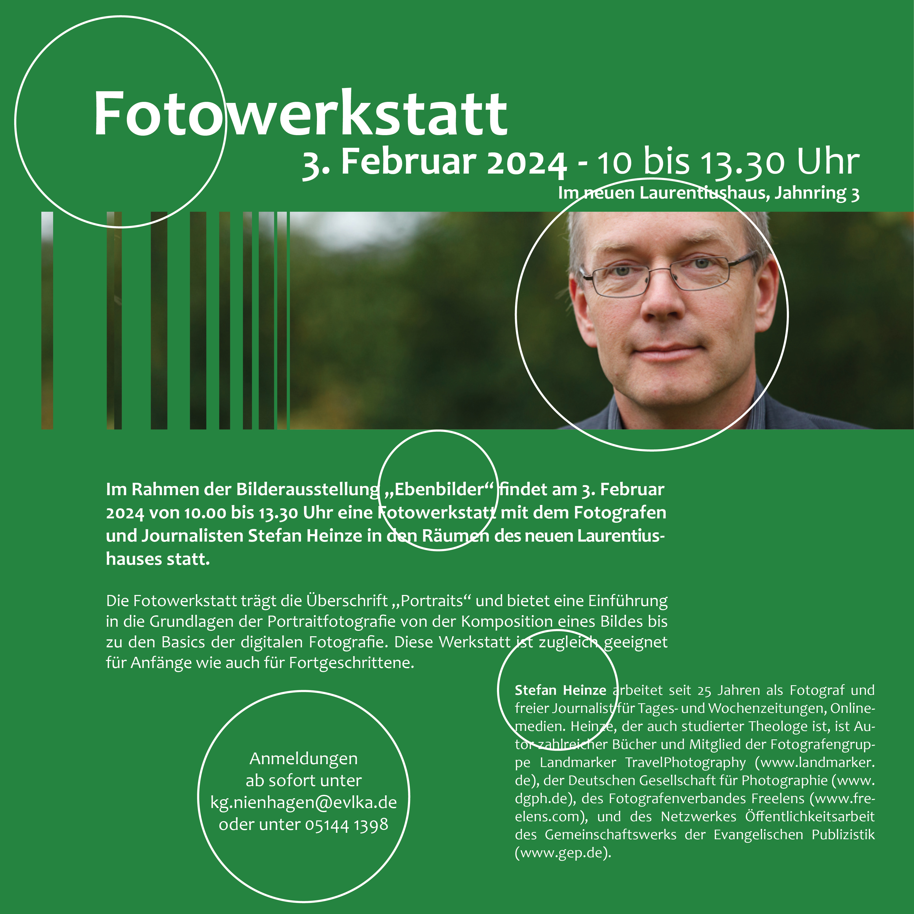 Im Rahmen der Bilderausstellung „Ebenbilder“ bietet Heinze am 3. Februar 2024 von 10 bis 13:30 Uhr eine Fotowerkstatt im neuen Laurentiushaus Nienhagen an. Die Werkstatt trägt den Titel „Portraits“ du bietet eine Einführung in die Grundlagen der Portraitfotografie von der Komposition eines Bildes bis zu den Basics der digitalen Fotografie. Sie ist geeignet für Anfänger und Fortgeschrittene.