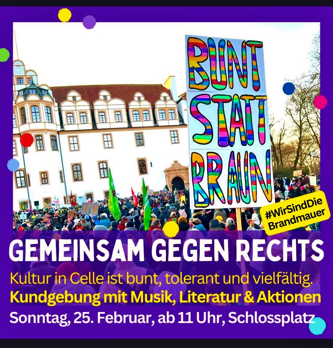 Bunt statt Braun - unter diesem Motto gehen auch am Sonntag, den 25. Februar 2024, Cellerinnen und Celler auf die Straße, um ein deutliches Zeichen gegen Rechts zu setzen. Los geht es ab 11 Uhr am Schlossplatz. #wirsinddiebrandmauer