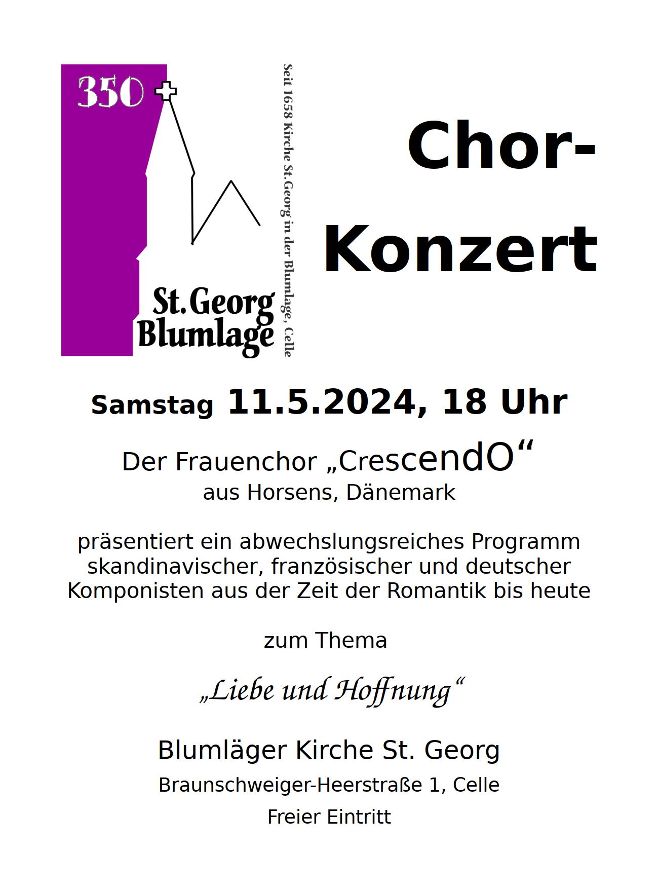 Musikalischer Hochgenuss in der Blumlage. Der Frauenchor "Crescendo" aus dem dänischen Horsens wird am Samstag, den 11. Mai, ein abwechslungsreiches Programm skandinavischer, französischer und deutscher Komponisten aus der Zeit der Romantik bis heute zum Thema "Liebe und Hoffnung" präsentieren. Los geht es um 18 Uhr in der St. Georg Kirche Celle-Blumlage.