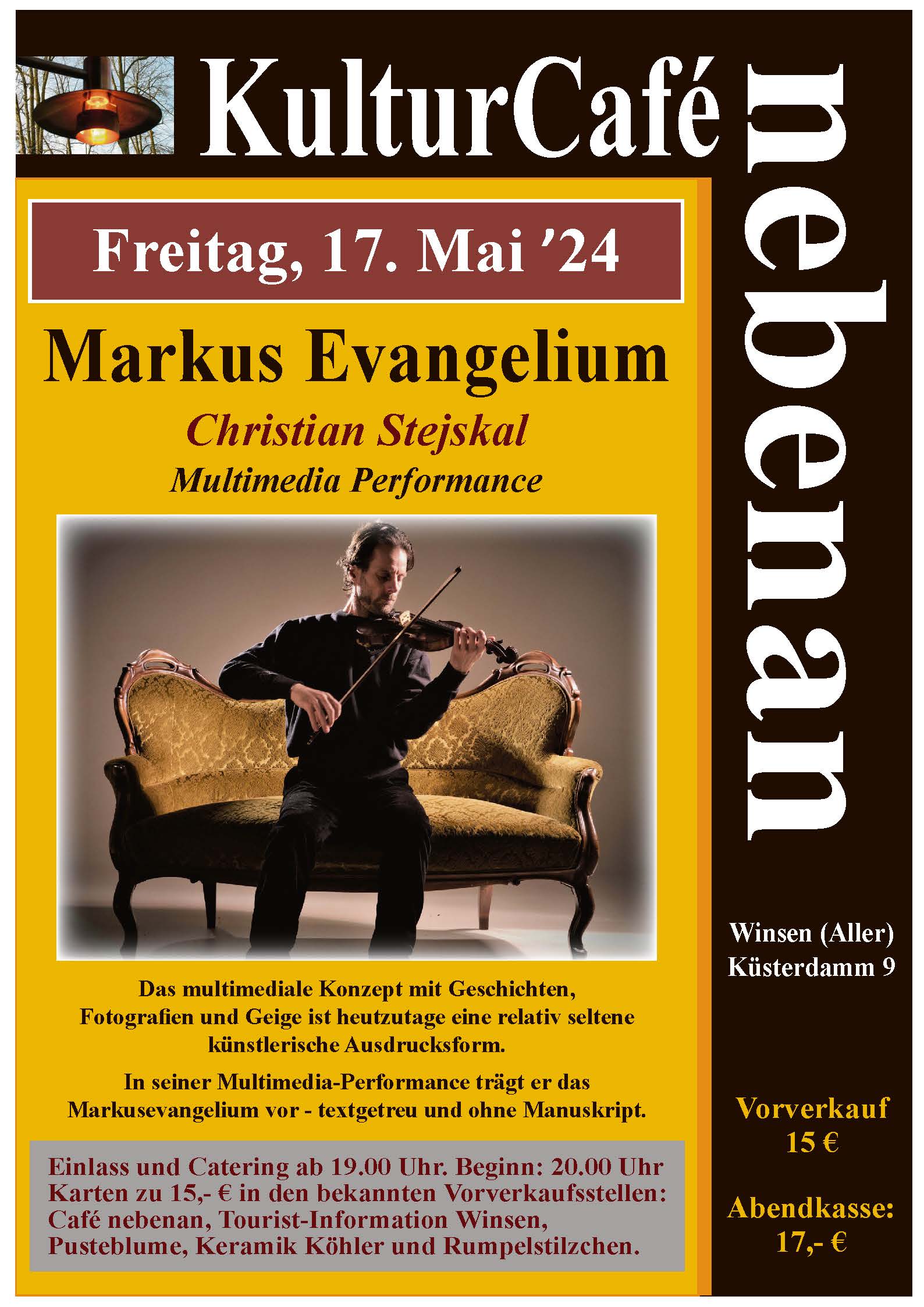 Geschichten, Fotografien, Geigenmusik – so haben Sie das Markusevangelium noch nie erlebt! Am Freitag, den 17. Mai 2024, lädt das Winsener Kultur-Café nebenan (Küsterdamm 9, 29308 Winsen/Aller) zu einer ganz besonderen Veranstaltung. Der Fotograf, professioneller Geiger und begnadete Erzähler Christian Stejskal trägt das Markusevangelium vor. Textgetreu, ohne Manuskript und verpackt in einer einzigartigen Multimedia-Performance.