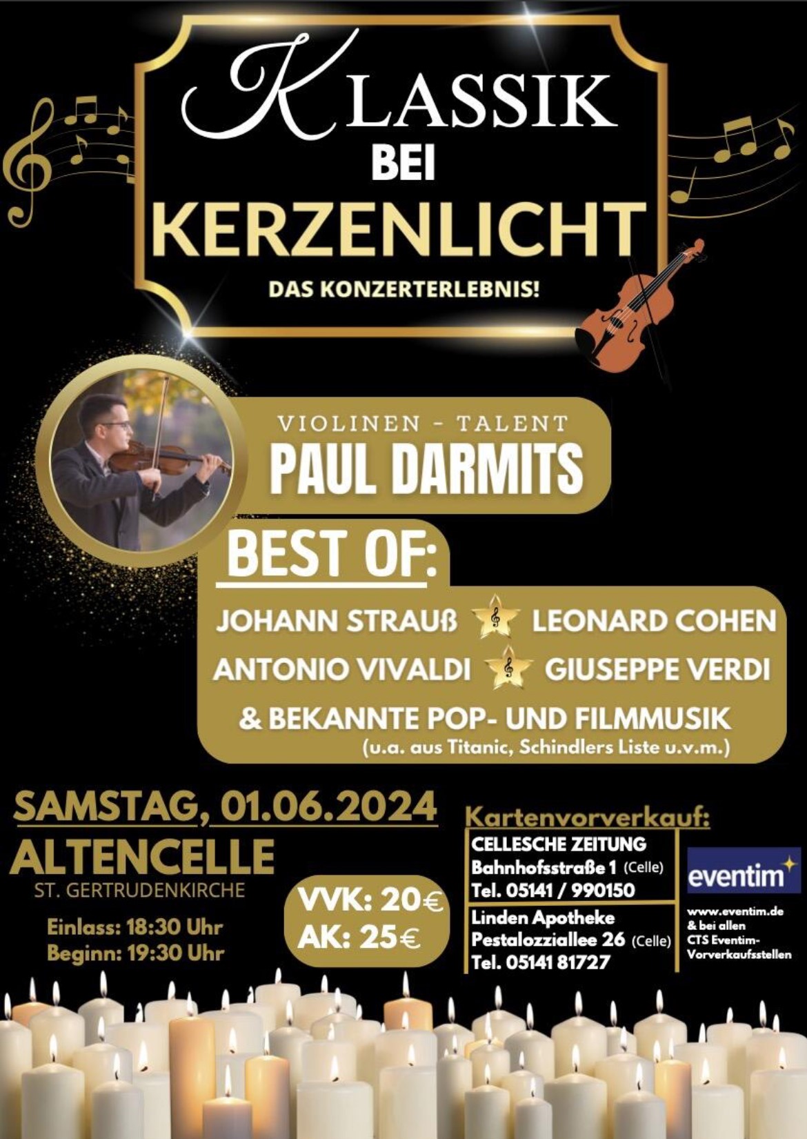 Konzerterlebnis bei Kerzenschein in Altencelle: Paul Darmits füllt die Gertrudenkirche mit Klängen der Violine und bietet den Konzertbesuchern u.a. eine Auswahl von Antonio Vivaldi, Johann Strauß sowie Pop- und Filmmusik. Eine Vielzahl an Kerzen wird die besondere Atmosphäre prägen und den Abend unvergesslich machen.