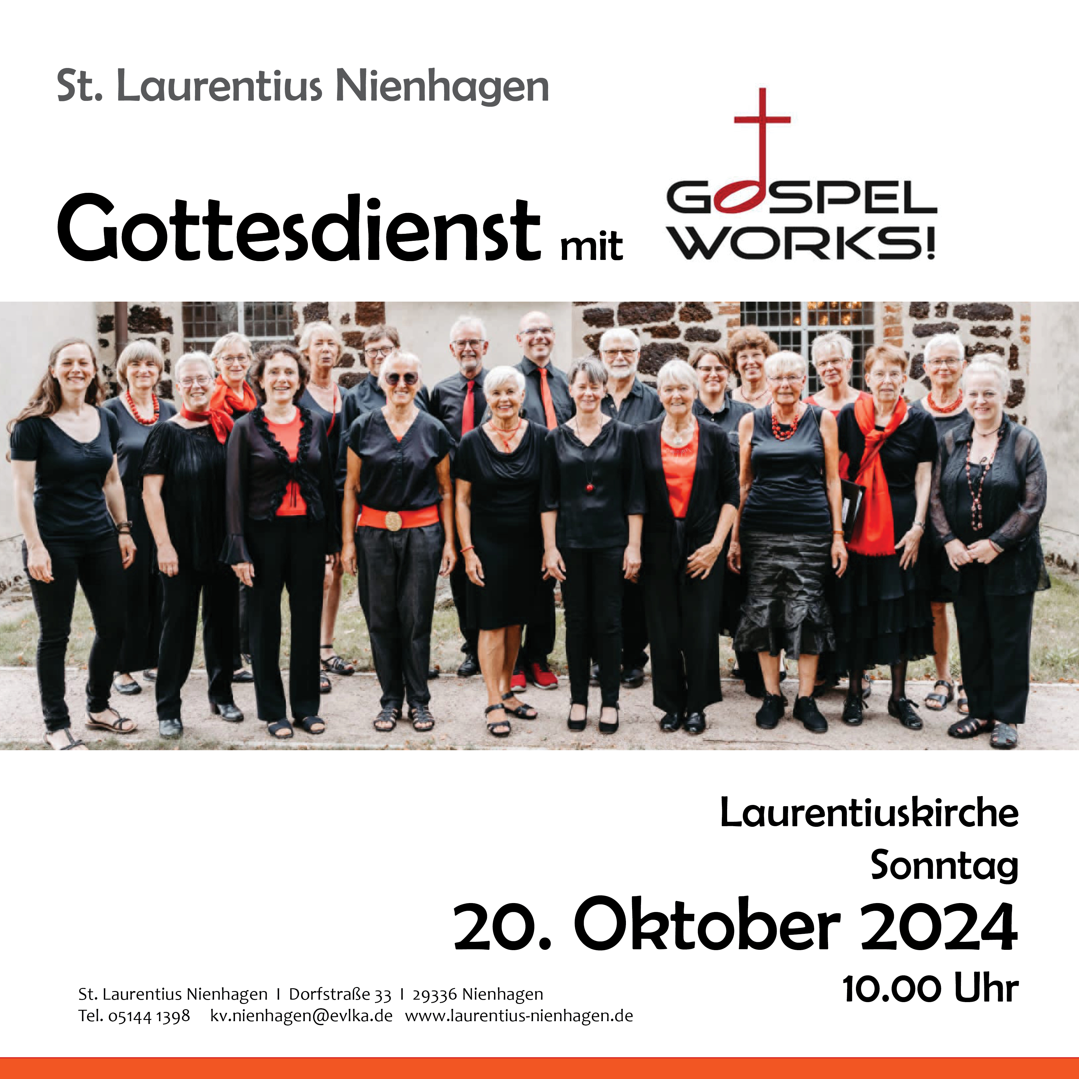 Gottesdienst mit Gospel Works! am Sonntag, den 20. Oktober 2024 um 10 Uhr in der Laurentiuskirche Nienhagen.