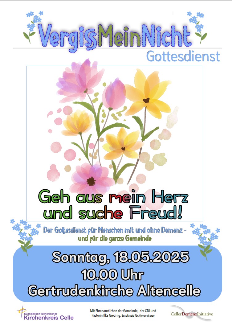 Der Ev.-luth. Kirchenkreis Celle feiert gemeinsam mit der Celler Demenz Initiative e.V. einen Gottesdienst für Menschen mit und ohne Demenz und deren An- und Zugehörigen. Gemeinsam wollen wir den Frühling feiern und uns über Gottes Schöpfung freuen.