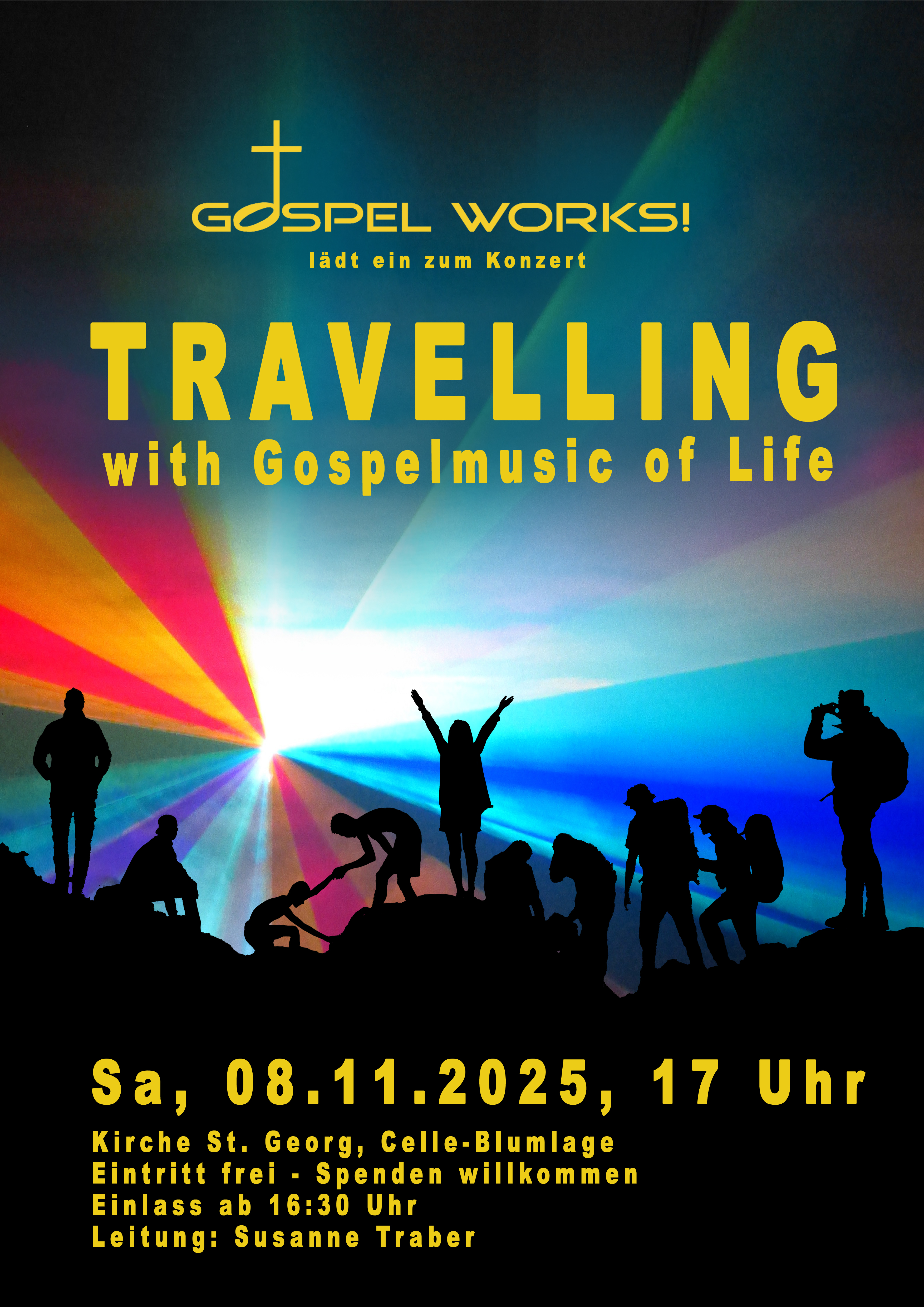 „Travelling with Gospelmusic of Life“ lautet der Titel. Spirituals, Worship- und Gospelsongs erzählen von Aufbruch, Unterwegssein und Ankommen. Denn das Leben selbst gleicht einer Reise – voller Aufbrüche, Umwege und neuer Perspektiven. Daneben gibt es Momente, in denen zu spüren ist: Wir sind längst angekommen – bei uns selbst, im Einklang mit dem, was uns trägt. Dieses Konzert macht beides hörbar: die Bewegung und das Ankommen.