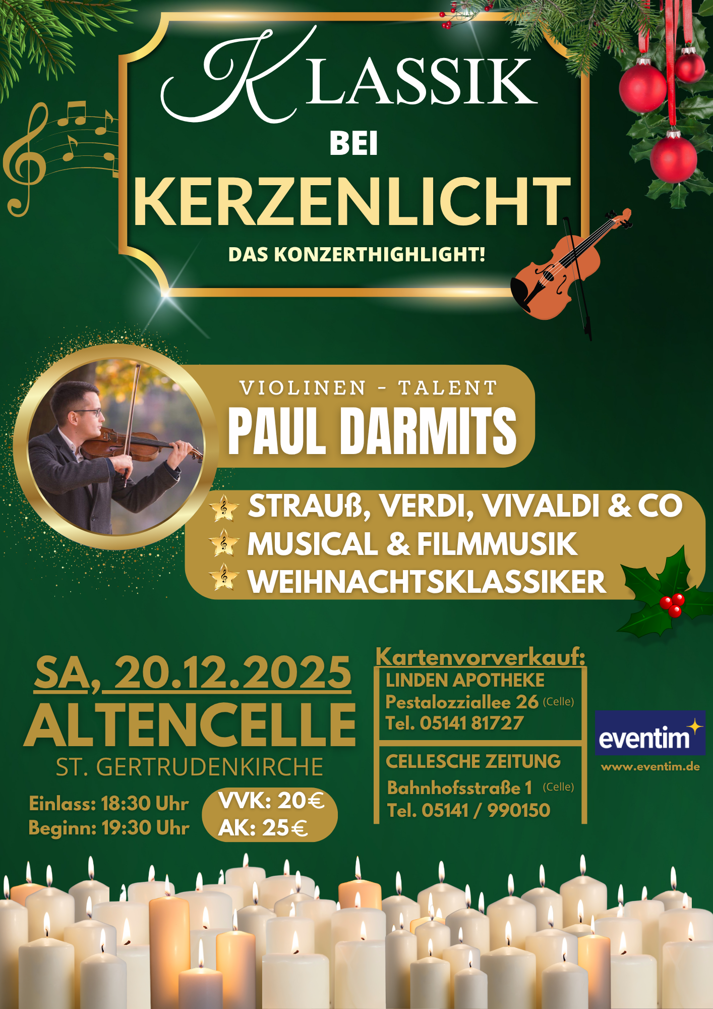 Im Fokus stehen bei dem fast zweistündigen Programm nicht nur Hunderte von romantisch leuchtenden Kerzen und neue magische Lichteffekte, sondern auch das Violinen-Talent Paul Darmits. Ein begabter Künstler, der die klassische Musik lebt und liebt und das ganze Jahr über auf Tournee ist. Einige Male war er schon in Altencelle mit großem Erfolg zu Gast und schwärmt von dem herzlichen und musikalischen Publikum. Paul wird neben bekannten Welthits von Vivaldi, Strauß und Verdi auch große Weihnachtsklassiker und beliebte Werke aus der Film- und Musicalwelt spielen. Ein stimmungsvoller und abwechslungsreicher Abend voller Musik! Ein Genuss für die Sinne und ein echtes Hör- und Klangerlebnis. Es darf mitgesungen und mitgeklatscht werden. Dabei werden auch die sanften Töne zur Weihnachtszeit eine wichtige Rolle spielen.