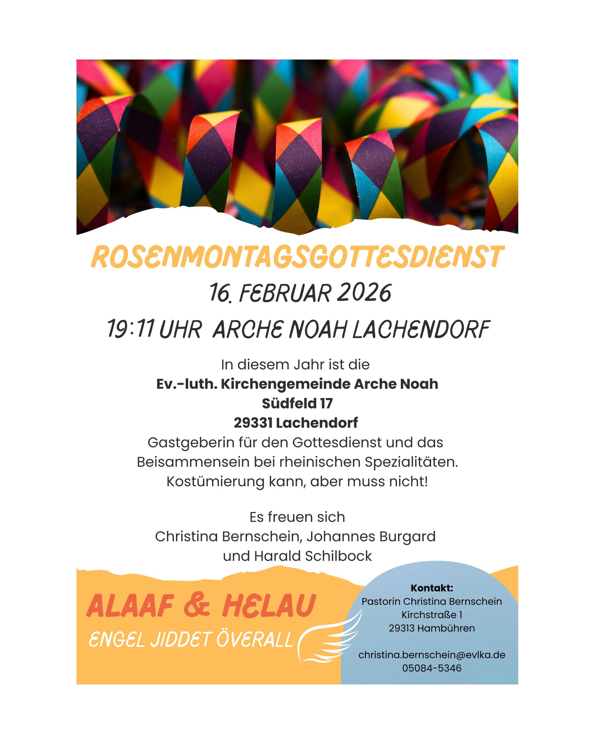 Wenn Engel schunkeln und die Kirche lacht, dann ist wieder Rosenmontagsgottesdienst. Bereits zum vierten Mal wird auch der Ev.-luth. Kirchenkreis narrisch.In diesem Jahr lädt die Arche Noah in Lachendorf herzlich ein. „Am 16. Februar 2026 um 19:11 Uhr wollen wir zeigen, dass Glaube und Frohsinn wunderbar zusammenpassen. Ob verkleidet oder ganz alltäglich – alle sind herzlich willkommen“, sagt Mit-Organisator Harald Schilbock von der Laurentiusgemeinde aus Nienhagen. Im Anschluss an den Gottesdienst warten die gewohnt leckeren rheinischen Spezialitäten. „Damit möchte die Kirchengemeinde ein Zeichen für Gemeinschaft und Lebensfreude setzen“, sagt Schilbock.