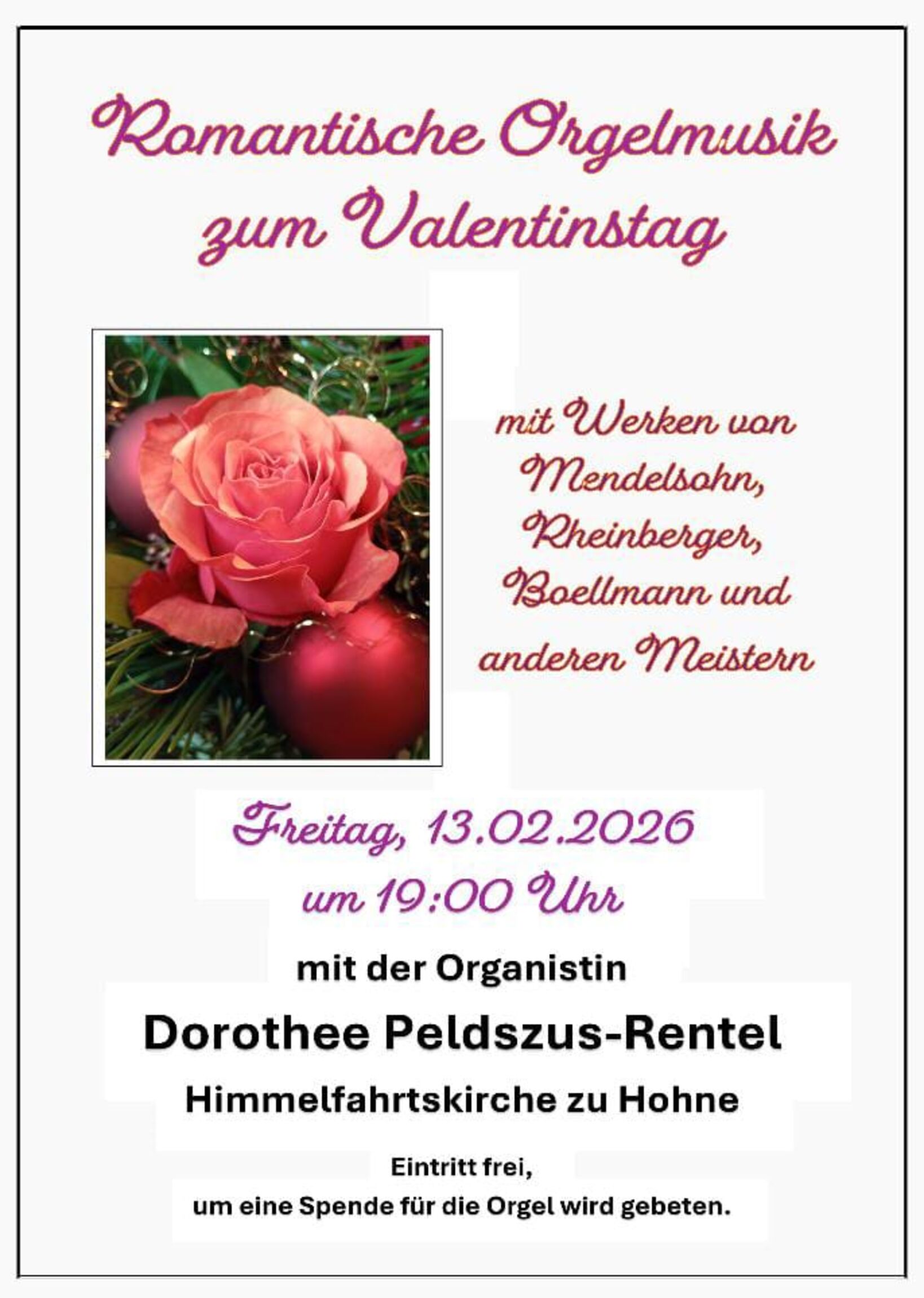 Zu einem ganz besonderen Orgelkonzert lädt die Kirchengemeinde Hohne am 13. Februar 2026 um 19 Uhr in die Himmelfahrtskirche ein. Es wird eine romantische Einstimmung auf den Valentinstag.